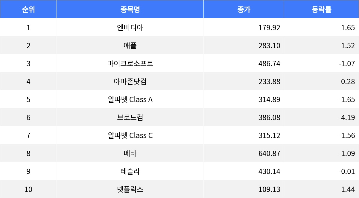 1일(현지시간) 기준, 나스닥 종합 시가총액 상위 종목은 대체로 혼조세를 보였다. 상승과 하락을 반복하며 변동성을 드러낸 가운데, 일부 종목은 상승세를 기록한 반면, 다른 종목들은 하락세를 피하지 못했다.상승 종목 중에서는 엔비디아가 1.65% 오른 179.92달러에 거래를 마쳤다. 거래량은 1억 8천 1백 56만 6천 165주로 전 거래일 대비 2.92% 증가했다. 애플도 1.52% 상승하며 283.10달러를 기록했으며, 거래량은 4천 5백 49만 7천 926주로 전 거래일 대비 4.25% 증가했다. 넷플릭스는 1.44% 올라 109.13달러에 마감됐고, 거래량은 2천 4백 5만 2천 909주로 전 거래일 대비 1.55% 늘었다.