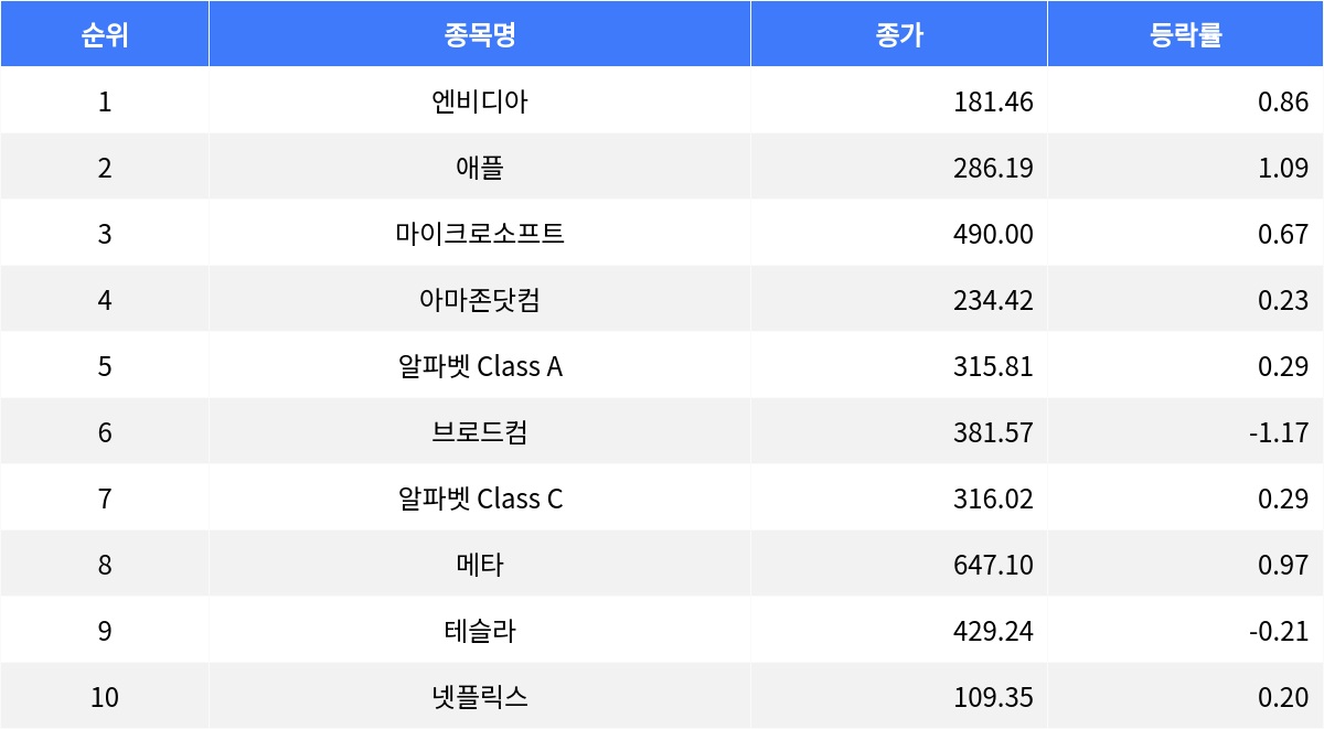 2일(현지시간) 기준, 나스닥 종합 시가총액 상위 종목은 대체로 상승세를 보였다. 기술주들이 주도하는 나스닥에서 주요 종목들은 긍정적인 주가 흐름을 나타냈다.엔비디아는 0.86% 상승하며 181.46달러로 장을 마감했다. 거래량은 1억 7천 864만 7천 756주로 전 거래일 대비 1.54달러 상승했다. 애플은 1.09% 오른 286.19달러에 거래를 마쳤으며, 거래량은 5천 299만 3천 795주로 전 거래일 대비 3.09달러 상승했다. 마이크로소프트의 종가는 490달러로 0.67% 올랐으며, 거래량은 1천 850만 8천 872주로 전 거래일 대비 3.26달러 상승했다.