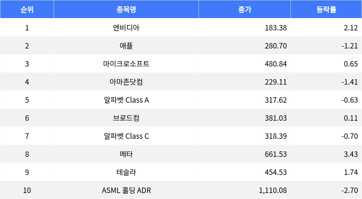 4일(현지시간) 기준, 나스닥 종합 시가총액 상위 종목은 혼조세를 보였다. 엔비디아와 메타 등의 기술주는 상승세를 보였으나, 애플과 아마존닷컴 등은 하락세를 나타냈다.이날 엔비디아 주가는 전 거래일 대비 2.12% 상승한 183.38달러로 마감했다. 거래량은 1억 6천 604만 8천 225주로 집계되었으며, 전 거래일 대비 3.80달러 올랐다. 메타 역시 3.43% 상승해 661.53달러로 거래를 마쳤으며, 거래량은 2천 968만 4천 349주에 달했다.