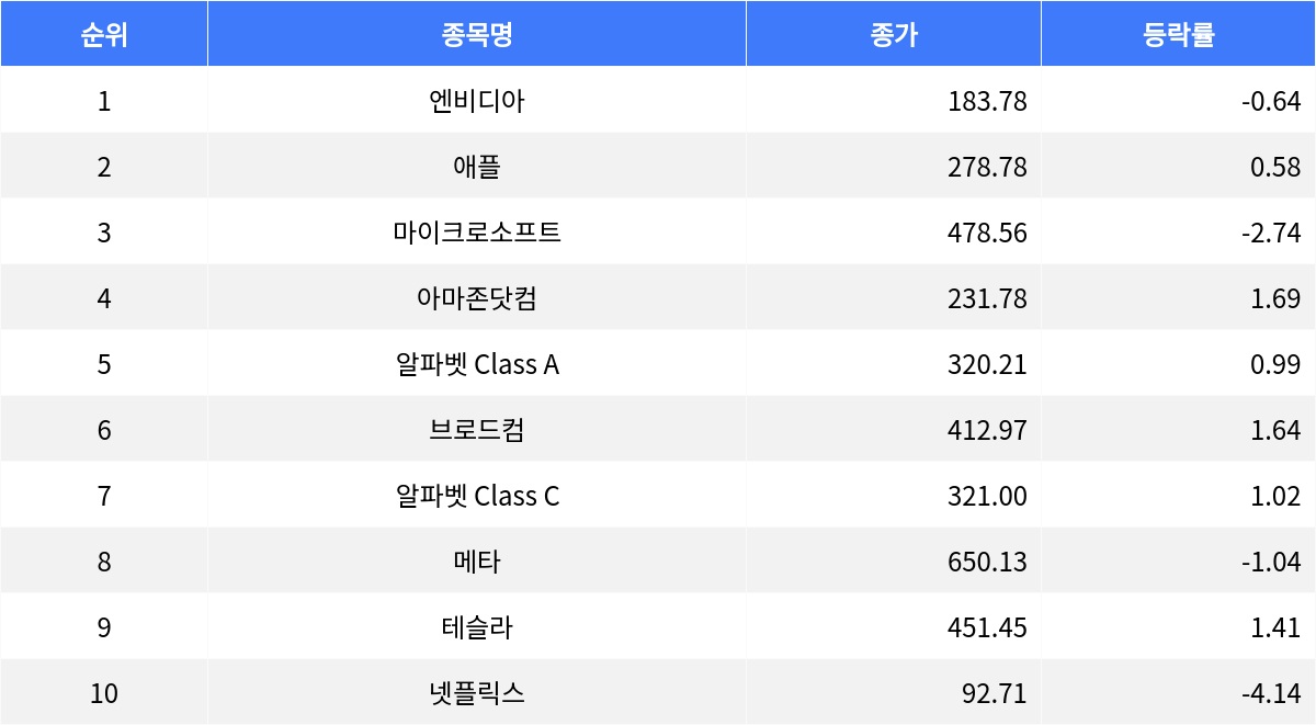 반면, 하락한 종목으로는 넷플릭스가 4.14% 하락하여 92.71달러에 거래를 마감했다. 거래량은 7천 326만 2천 579주였다. 마이크로소프트도 하락세를 보여 2.74% 하락한 478.56달러를 기록하며, 거래량은 3천 451만 7천 396주였다. 엔비디아는 0.64% 하락하여 183.78달러에 마감했으며, 거래량은 1억 580만 4천 710주였다. 메타는 1.04% 하락하며 650.13달러로 장을 마쳤고, 거래량은 1천 593만 2천 77주였다.