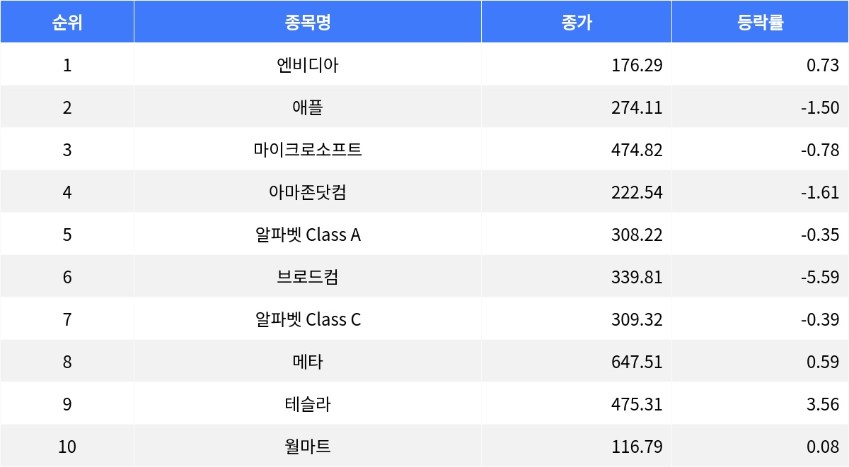 반면, 애플은 전 거래일 대비 4.17달러 하락하며 1.50% 떨어진 274.11달러에 거래를 마쳤다. 거래량은 4천 968만 주였다. 아마존닷컴 역시 전 거래일 대비 3.65달러 하락해 1.61% 떨어진 222.54달러로 마감했다. 거래량은 4천 584만 주를 기록했다. 브로드컴은 전 거래일 대비 20.12달러 떨어져 5.59% 하락한 339.81달러에 거래를 마쳤으며, 거래량은 6천 528만 주에 달했다.