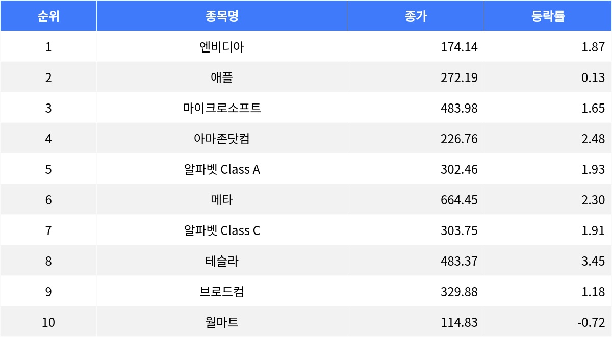 2023년 10월 23일 기준, 나스닥 종합 시가총액 상위 종목들이 전반적으로 상승세를 보였다. 주요 기술주들이 강세를 나타내며 시장의 긍정적인 분위기를 주도했다.