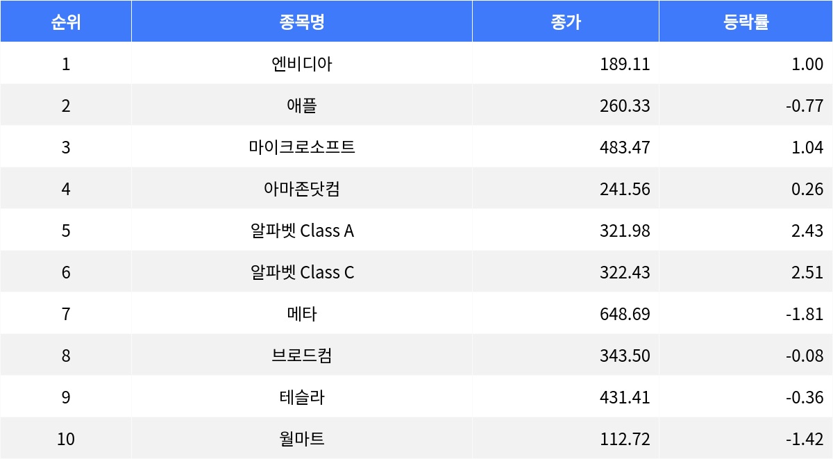 나스닥 100 지수에서 상승한 주요 종목으로는 엔비디아와 마이크로소프트가 주목받았습니다. 엔비디아는 1.00% 상승하며 종가 189.11달러를 기록했고, 거래량은 1억 5천 291만 5천 181주로 활발했습니다. 마이크로소프트는 1.04% 상승해 종가 483.47달러를 기록하며, 전 거래일 대비 4.96달러 상승했습니다. 또한 알파벳 Class A와 C도 각각 2.43%, 2.51% 오르며 321.98달러와 322.43달러의 종가를 기록했습니다.