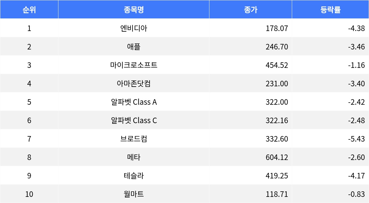 마이크로소프트는 -1.16% 하락한 454.52달러로 마감했으며, 거래량은 2천 598만 841주로 전 거래일 대비 5.34포인트 떨어졌다. 알파벳의 Class A와 Class C 주식은 각각 -2.42%와 -2.48% 하락하며 322.00달러와 322.16달러로 거래를 마쳤다. 브로드컴은 -5.43% 하락한 332.60달러로 마감하며 가장 큰 하락폭을 기록했다.