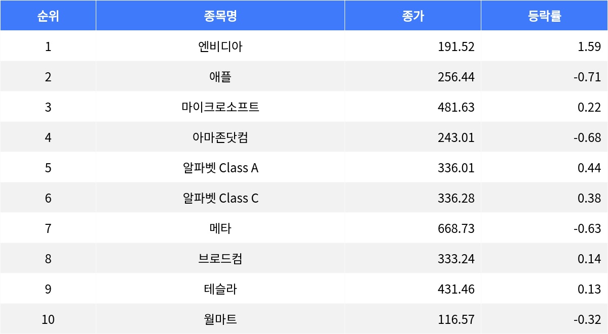 28일(현지시간) 기준, 나스닥 종합 시가총액 상위 종목은 혼조세를 보였다. 주요 기술주 가운데 일부는 상승세를, 다른 일부는 하락세를 기록하며 엇갈린 흐름을 나타냈다.엔비디아는 1.59% 상승하며 종가 191.52달러를 기록했다. 거래량은 1억 4천 606만 403주로 전 거래일 대비 3.00달러 상승했다. 마이크로소프트 역시 0.22% 상승한 481.63달러에 거래를 마쳤다. 알파벳 Class A와 Class C는 각각 0.44%와 0.38% 상승하며 종가 336.01달러와 336.28달러를 기록했다.