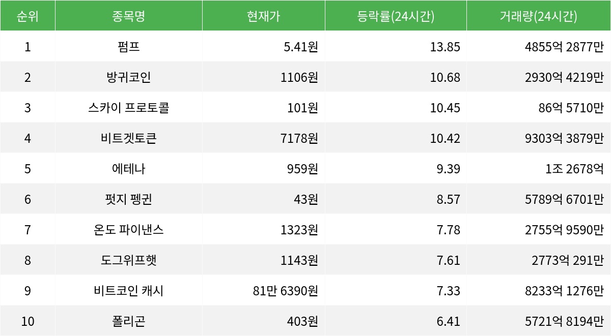 글로벌 가상자산 시황 중계 사이트 코인마켓캡(CoinMarketCap)에 따르면, 암호화폐 시장에서 펌프가 24시간 동안 13.85%라는 가장 높은 상승률을 기록하며 주목받고 있다. 현재 시가총액 1조 9166억 원으로 시가총액 순위 65위를 차지하고 있으며, 현재가는 5.41원이다. 24시간 거래량은 4855억 2877만 원에 달하며, 1시간 동안 0.88% 상승하여 상승세를 이어가고 있다.두 번째로 상승률이 높은 방귀코인은 24시간 동안 10.68% 상승하며 1106원에 거래되고 있다. 시가총액은 1조 1068억 원으로, 시가총액 순위는 92위이다. 24시간 거래량은 2930억 4219만 원을 기록했으며, 1시간 동안 0.17% 하락했다.