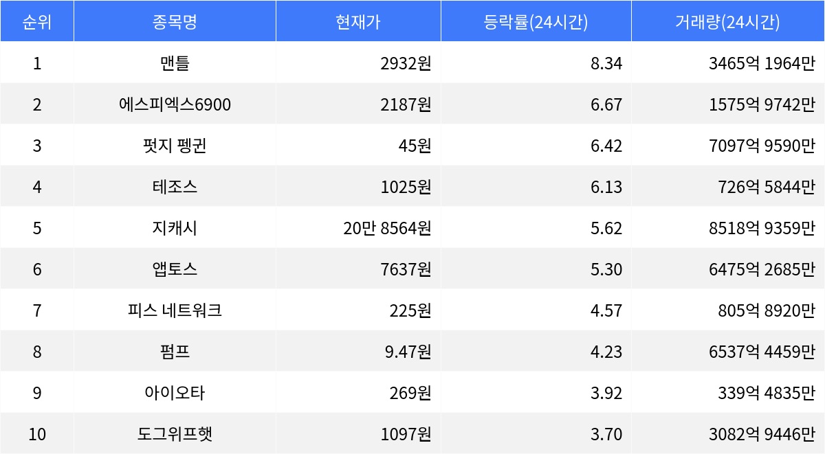 6위부터 10위까지의 종목도 상승세를 보였다. 앱토스는 5.30% 상승, 피스 네트워크는 4.57% 상승, 펌프는 4.23% 상승, 아이오타는 3.92% 상승, 도그위프햇은 3.70% 상승하며 각각의 가격 변동을 기록했다. 그러나 이들 종목은 1시간 등락률에서 대부분 하락세를 보이며, 단기 조정의 가능성을 내비쳤다.