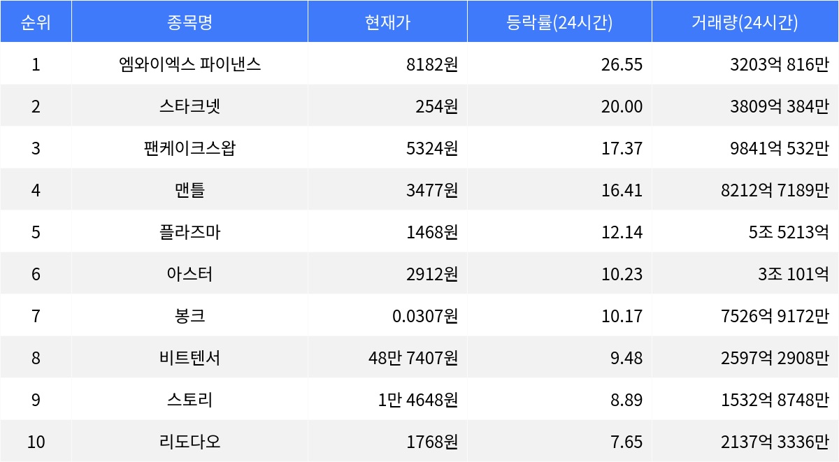 글로벌 가상자산 시황 중계 사이트 코인마켓캡(CoinMarketCap)에 따르면, 엠와이엑스 파이낸스가 암호화폐 시장에서 24시간 동안 가장 높은 상승률을 기록하며 주목받고 있다. 엠와이엑스 파이낸스는 26.55%의 상승률을 보이며 현재 8182원에 거래되고 있으며, 1시간 등락률은 -9.18%로 단기 조정세를 보였다. 24시간 거래량은 3203억 816만 원으로 시장의 관심이 집중되고 있음을 알 수 있다.스타크넷은 24시간 동안 20.00%의 상승률을 기록하며 상승세를 이어가고 있다. 현재 254원에 거래되고 있으며, 1시간 등락률은 -0.13%로 비교적 안정적인 흐름을 유지하고 있다. 스타크넷의 24시간 거래량은 3809억 384만 원으로, 투자자들의 활발한 거래가 이루어지고 있다.