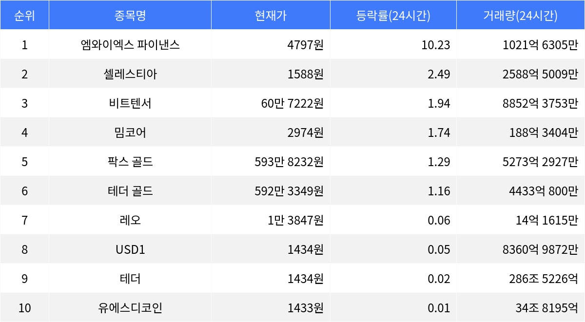 글로벌 가상자산 시황 중계 사이트 코인마켓캡(CoinMarketCap)에 따르면, 최근 암호화폐 시장에서 엠와이엑스 파이낸스가 24시간 동안 10.23% 상승하며 가장 큰 상승률을 기록하고 있다. 현재 엠와이엑스 파이낸스는 4797원에 거래되고 있으며, 24시간 거래량은 1021억 6305만 원에 달한다. 1시간 등락률 또한 2.46% 상승하여 단기적으로도 강한 상승세를 보이고 있다.같은 시각, 셀레스티아는 24시간 동안 2.49% 상승하며 1588원에 거래 중이다. 셀레스티아는 24시간 동안 2588억 5009만 원의 거래량을 기록했으며, 1시간 동안 0.49% 하락하여 단기적으로는 상승세가 주춤하는 모습을 보인다.