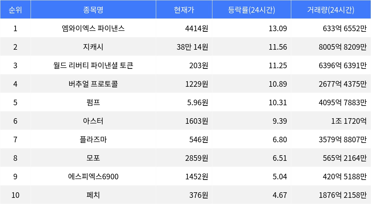 한편, 아스터는 24시간 동안 9.39% 상승하며 현재 1603원에 거래되고 있으며, 1시간 동안 0.31% 상승했다. 플라즈마는 24시간 동안 6.80% 상승하며 현재 546원에 거래되고 있으며, 1시간 동안 2.20% 상승했다. 모포는 24시간 동안 6.51% 상승하며 현재 2859원에 거래되고 있으며, 1시간 동안 0.59% 상승했다. 에스피엑스6900은 24시간 동안 5.04% 상승하며 현재 1452원에 거래되고 있으며, 1시간 동안 -0.61% 하락했다. 페치는 24시간 동안 4.67% 상승하며 현재 376원에 거래되고 있으며, 1시간 동안 -2.28% 하락했다.