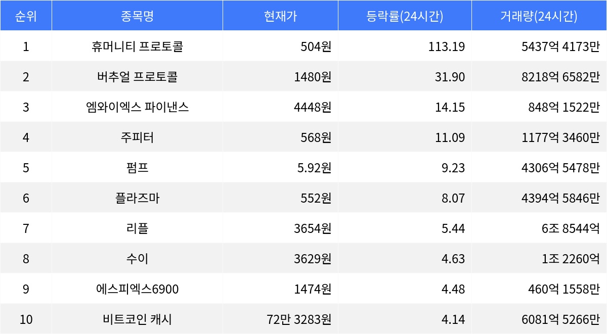글로벌 가상자산 시황 중계 사이트 코인마켓캡(CoinMarketCap)에 따르면, 최근 암호화폐 시장에서 가장 큰 상승세를 보인 종목은 휴머니티 프로토콜이다. 휴머니티 프로토콜은 24시간 동안 113.19% 상승하며 현재 504원에 거래되고 있으며, 시가총액은 1조 992억 원으로 시가총액 순위 82위를 기록했다. 24시간 동안 5437억 4173만 원의 거래량을 기록하며, 1시간 등락률은 0.51% 상승했다. 이는 상승세가 지속되고 있음을 나타낸다.버추얼 프로토콜도 주목할 만하다. 24시간 동안 31.90% 상승하며 현재 1480원에 거래되고 있다. 시가총액은 9710억 664만 원으로 시가총액 순위 90위에 올라있다. 하지만 1시간 등락률은 -6.21%로 단기적으로 하락세로 전환된 모습이다. 거래량은 8218억 6582만 원을 기록했다.