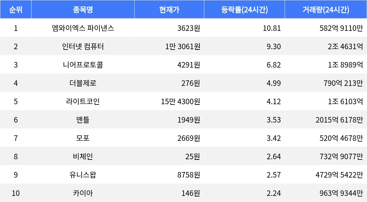글로벌 가상자산 시황 중계 사이트 코인마켓캡(CoinMarketCap)에 따르면, 암호화폐 시장에서 엠와이엑스 파이낸스가 24시간 동안 가장 높은 상승률을 기록했다. 엠와이엑스 파이낸스는 10.81% 상승하며 현재 3623원에 거래되고 있으며, 582억 9110만 원의 거래량을 기록 중이다. 1시간 등락률은 2.59%로 단기적으로도 상승세를 이어가고 있다. 시가총액 순위는 96위에 위치해 있다.인터넷 컴퓨터는 24시간 동안 9.30% 상승하며 현재 1만 3061원에 거래되고 있다. 24시간 거래량은 2조 4631억 원에 달하며, 시가총액 순위는 27위로 기록되어 있다. 그러나 1시간 등락률은 -1.07%로 단기적으로는 하락 전환의 가능성을 보여준다.