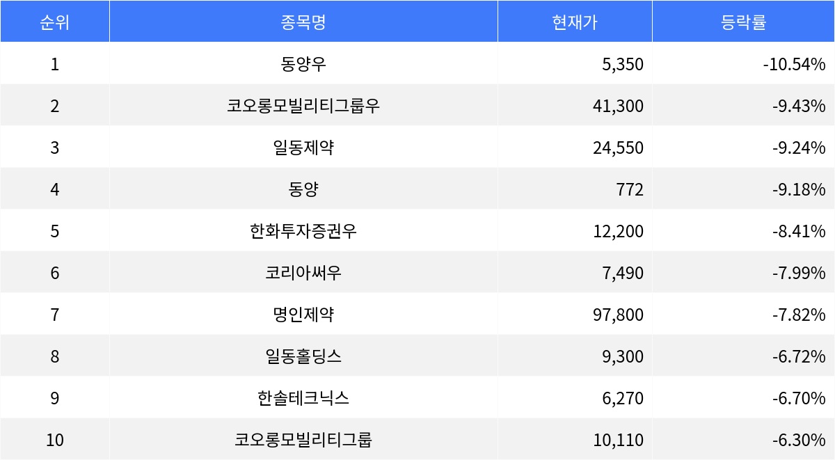 13일 장 마감 기준, 동양우(001525)가 등락률 -10.54%로 1위를 차지했다. 동양우의 현재가는 5,350원으로, 전 거래일 대비 10.54% 하락했다. 거래량은 132,538주로 기록되었으며, 매수총잔량은 3,539주, 매도총잔량은 2,438주로 수급 측면에서는 매수세가 상대적으로 우위에 있었다. PER은 -15.33으로 나타났고, ROE는 자료가 제공되지 않았다.코오롱모빌리티그룹우(45014K)의 경우 현재가 41,300원으로, 전 거래일 대비 9.43% 하락했다. 거래량은 196,783주였으며 매수총잔량은 2,097주, 매도총잔량은 311주로 매수세가 우세했다. PER과 ROE는 각각 -625.76과 자료 미제공으로 확인되었다.