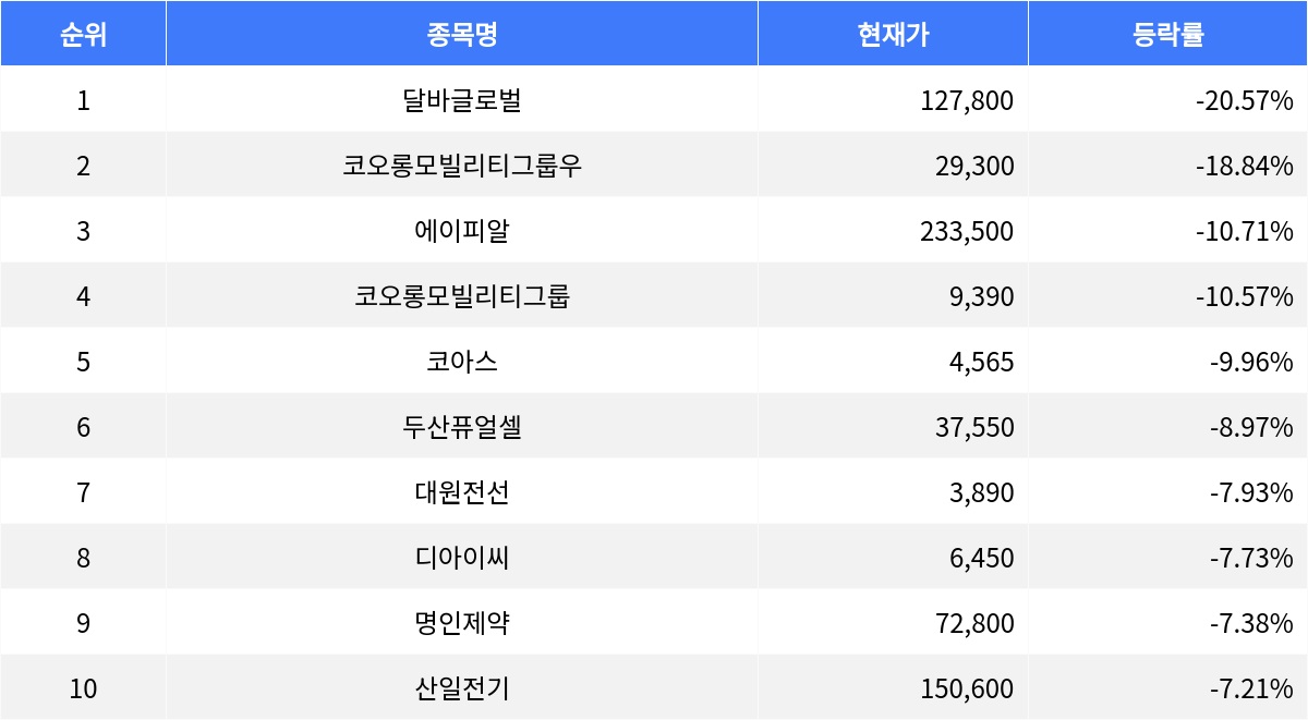 6일 장 마감 기준, 달바글로벌(483650)이 등락률 -20.57%로 1위를 차지했다. 달바글로벌의 현재가는 127,800원으로, 전 거래일 대비 20.57% 하락했다. 거래량은 1,013,241주였으며, 매수총잔량은 6,322주, 매도총잔량은 748주로 매수세가 우세했다. PER은 21.94, ROE는 26.21이었다.코오롱모빌리티그룹우(45014K)은 전 거래일 대비 18.84% 하락하며 29,300원에 거래를 마쳤다. 거래량은 1,084,970주로, 매수총잔량은 2,880주, 매도총잔량은 505주로 매수세가 강했다. PER은 -443.94로 음수를 기록했고, ROE는 제공되지 않았다.
