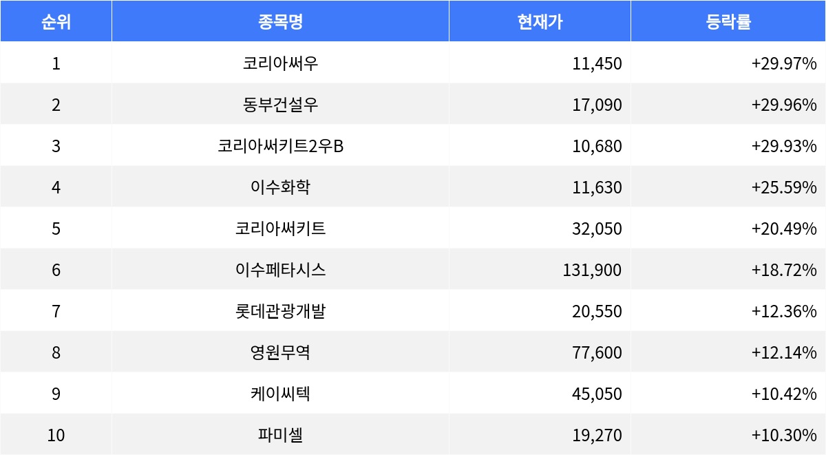 코리아써우, 동부건설우 등 상한가 기록...이수화학 25.59% 상승세