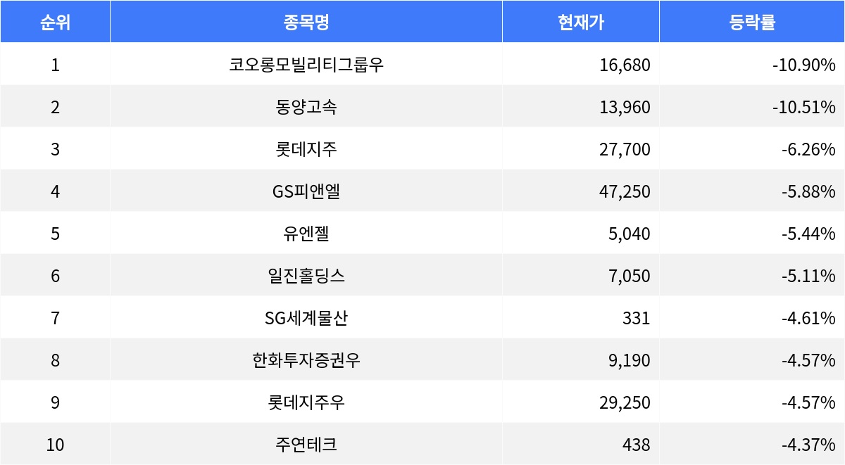 26일 장 마감 기준, 코오롱모빌리티그룹우(45014K)이 등락률 -10.90%로 1위를 차지했다. 코오롱모빌리티그룹우의 현재가는 16,680원으로, 전 거래일 대비 하락했다. 거래량은 113,251주였으며, 매수총잔량은 552주, 매도총잔량은 39주로 매수세가 우세했다. PER은 794.29이다.동양고속(084670)는 등락률 -10.51%로 2위에 올랐다. 현재가 13,960원으로, 거래량은 1,196,022주였다. 매도총잔량이 매수총잔량보다 많아 매도세가 강했다. PER은 -3.40, ROE는 -27.88이다.