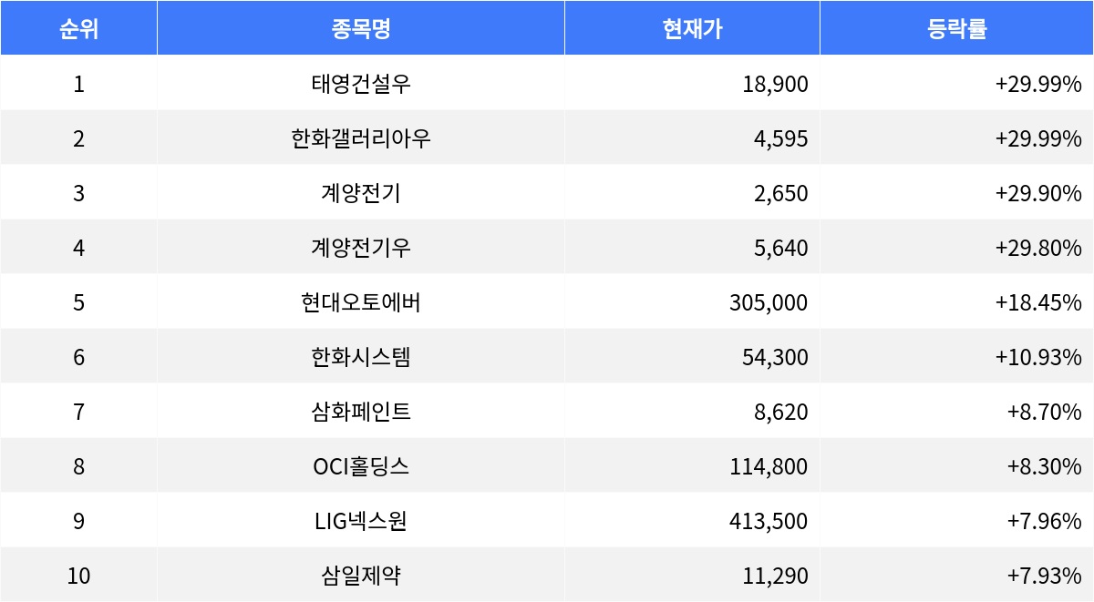 태영건설우와 한화갤러리아우가 각각 29.99% 등락률로 상한가를 기록했다. 계양전기와 계양전기우도 각각 29.90%, 29.80% 상승하며 시장의 주목을 받았다.