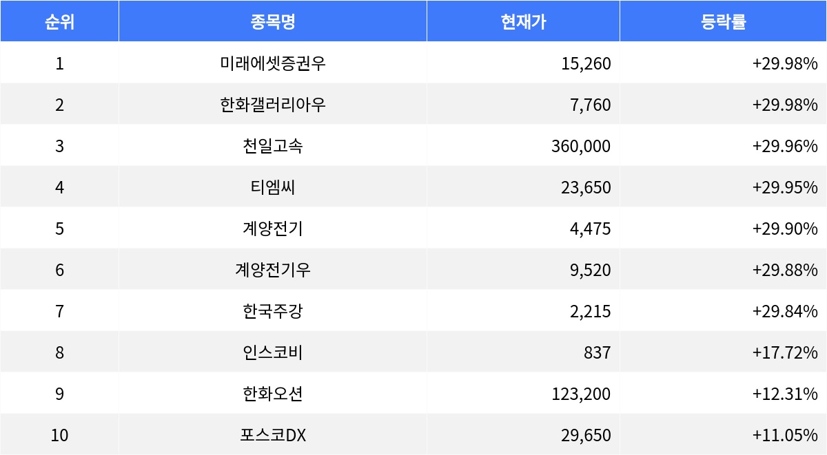 계양전기우(012205)는 등락률 +29.88%로 9,520원에 거래를 마쳤다. 한국주강(025890)은 +29.84%의 등락률로 2,215원에 거래를 마쳤다. 인스코비(006490)는 +17.72%로 837원에 거래를 마감했다. 한화오션(042660)은 +12.31%의 등락률로 123,200원에 거래를 마쳤다. 포스코DX(022100)는 +11.05%의 등락률을 기록하며 29,650원에 거래를 종료했다.