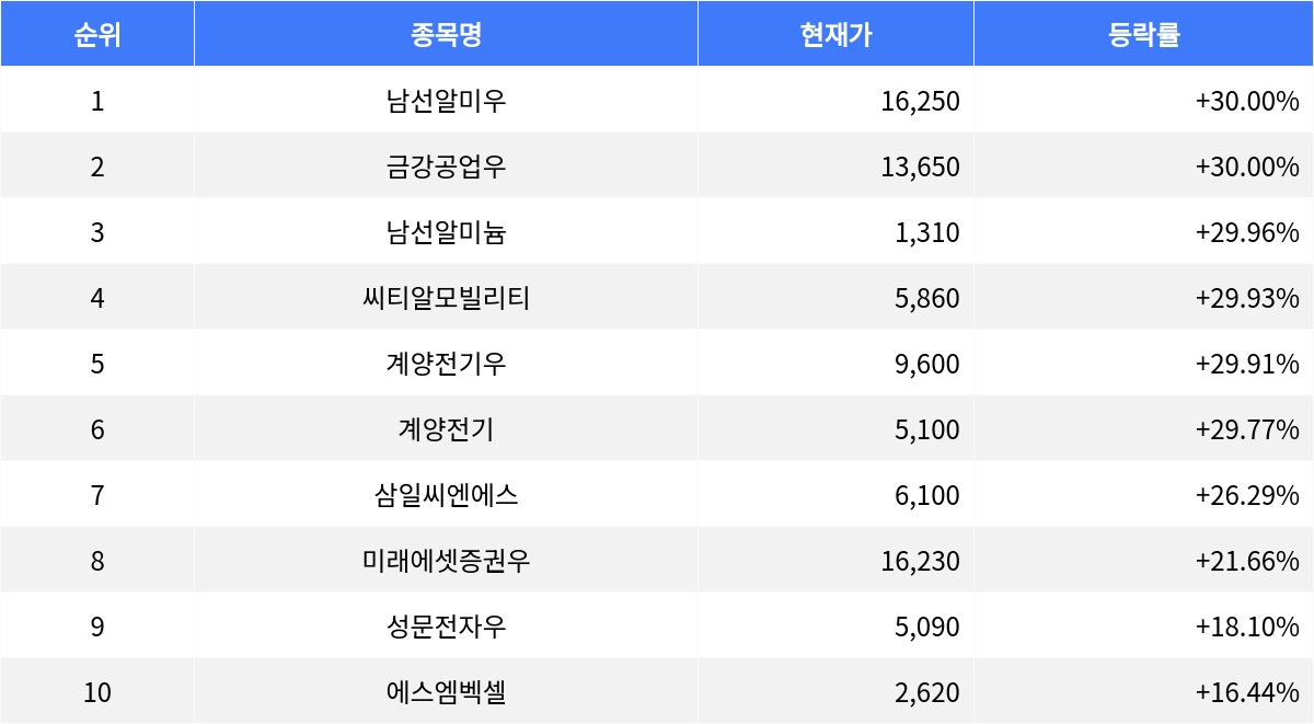 남선알미늄, 씨티알모빌리티 등 장 마감 기준 강한 매수세 보여