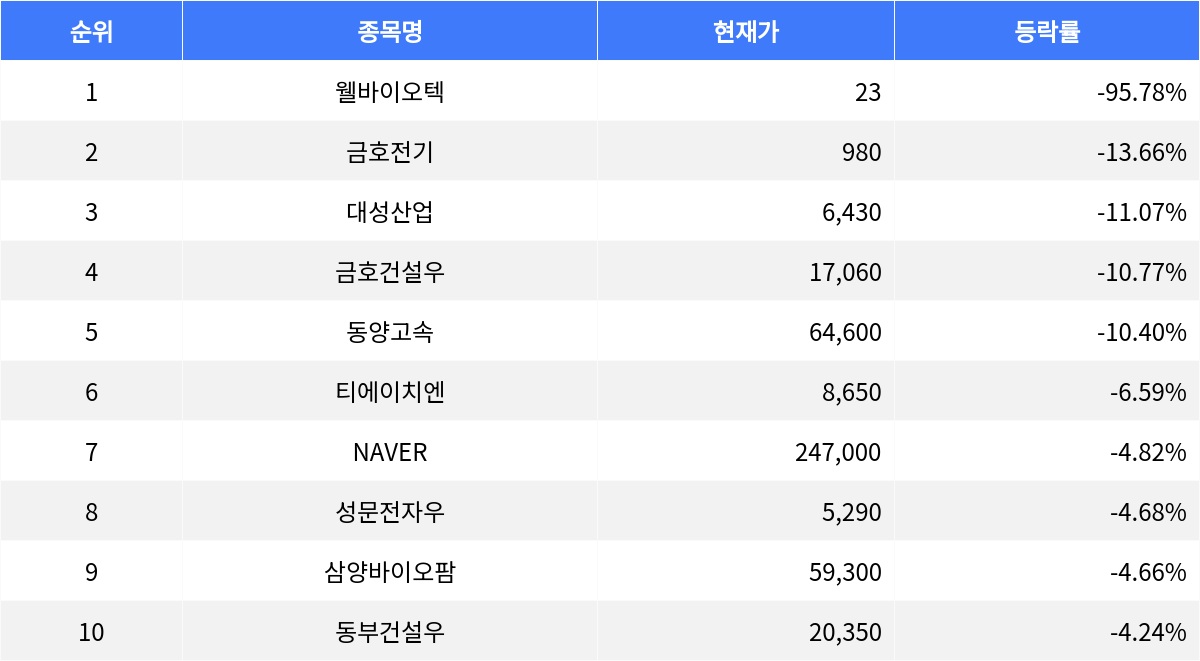 티에이치엔(019180)은 등락률 -6.59%로 현재가 8,650원이다. NAVER(035420)은 등락률 -4.82%로 현재가 247,000원이다. 성문전자우(014915)는 등락률 -4.68%로 현재가 5,290원이다. 삼양바이오팜(0120G0)은 등락률 -4.66%로 현재가 59,300원이다. 동부건설우(005965)는 등락률 -4.24%로 현재가 20,350원이다.