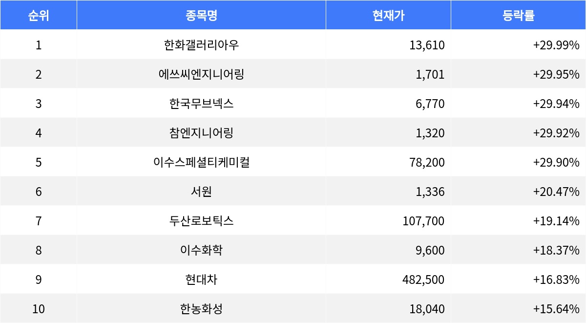 서원(021050)은 등락률 20.47%로 현재가 1,336원을 기록했다. 두산로보틱스(454910)는 등락률 19.14%로 현재가 107,700원을 보였다. 이수화학(005950)은 등락률 18.37%로 현재가 9,600원을 나타냈다. 현대차(005380)는 등락률 16.83%로 현재가 482,500원이었다. 한농화성(011500)은 등락률 15.64%로 현재가 18,040원을 기록했다.