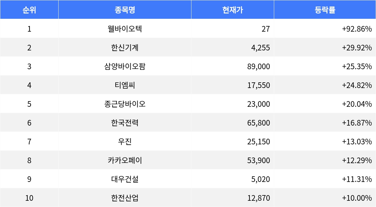 이어서, 여섯 번째로는 한국전력(015760)가 등락률 +16.87%로 상승했다. 현재가는 65,800원이다. 일곱 번째는 우진(105840)로, 등락률 +13.03%를 기록하며 현재가는 25,150원이다. 여덟 번째로는 카카오페이(377300)가 등락률 +12.29%로 상승했으며, 현재가는 53,900원이다. 아홉 번째는 대우건설(047040)로 등락률 +11.31%를 기록하며 현재가는 5,020원이다. 마지막으로 한전산업(130660)는 등락률 +10.00%로 상승했으며, 현재가는 12,870원이다.