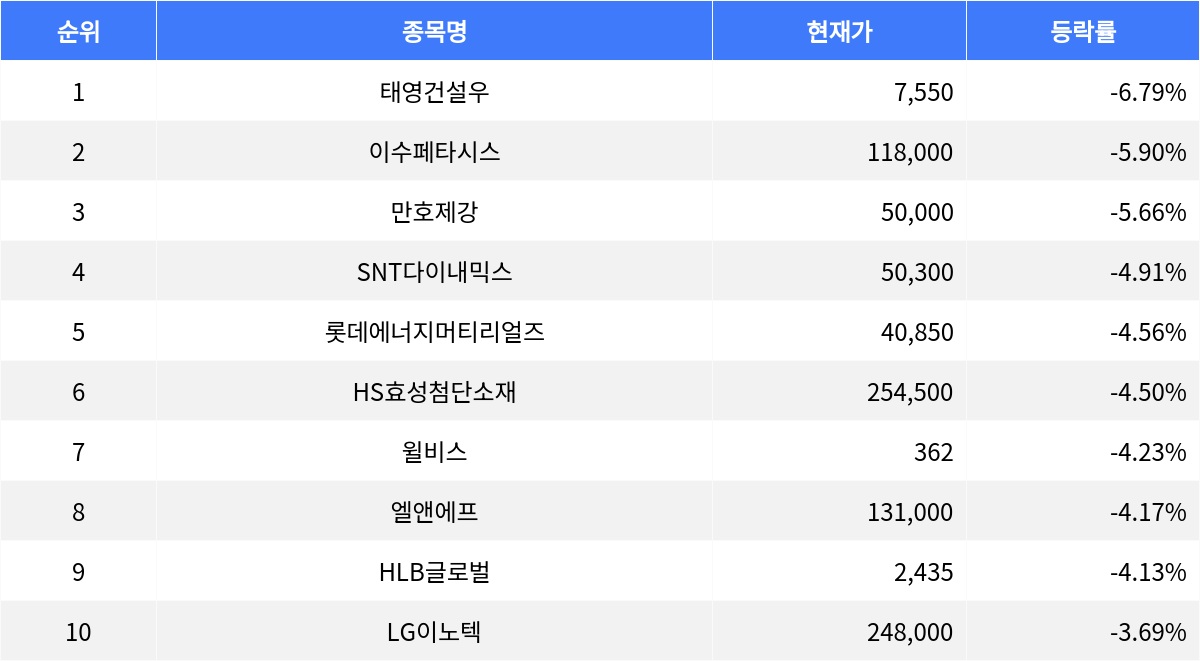 29일 장 마감 기준, 태영건설우(009415)가 등락률 -6.79%로 1위를 차지했다. 현재가는 7,550원으로, 전 거래일 대비 큰 폭으로 하락했다. 거래량은 16,702주로 나타났으며, 매수총잔량은 287주, 매도총잔량은 954주로 매도세가 우세했다. PER은 -33.71로 나타났으며, ROE는 제공되지 않았다.이수페타시스(007660)는 등락률 -5.90%를 기록하며 두 번째로 큰 하락률을 보였다. 현재가는 118,000원이며, 거래량은 2,687,676주였다. 매수총잔량은 35,038주, 매도총잔량은 19,725주로 매수세가 강했다. PER은 59.90, ROE는 24.92로 나타났다.