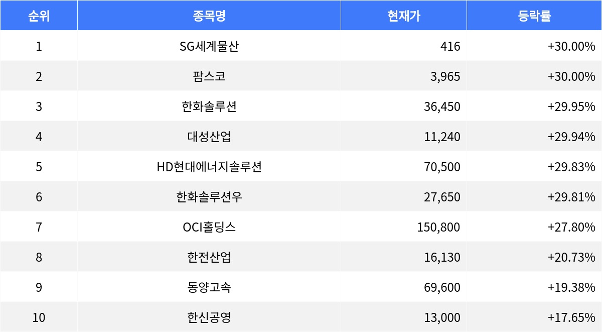 한화솔루션우(009835)는 등락률 29.81%로 현재가 27,650원을 기록했다. OCI홀딩스(010060)는 27.80% 상승하며 현재가 150,800원에 거래를 마쳤다. 한전산업(130660)는 20.73% 오른 16,130원을 기록했으며, 동양고속(084670)는 19.38% 상승한 69,600원에 장을 마감했다. 마지막으로 한신공영(004960)는 17.65%의 등락률로 13,000원을 기록했다.