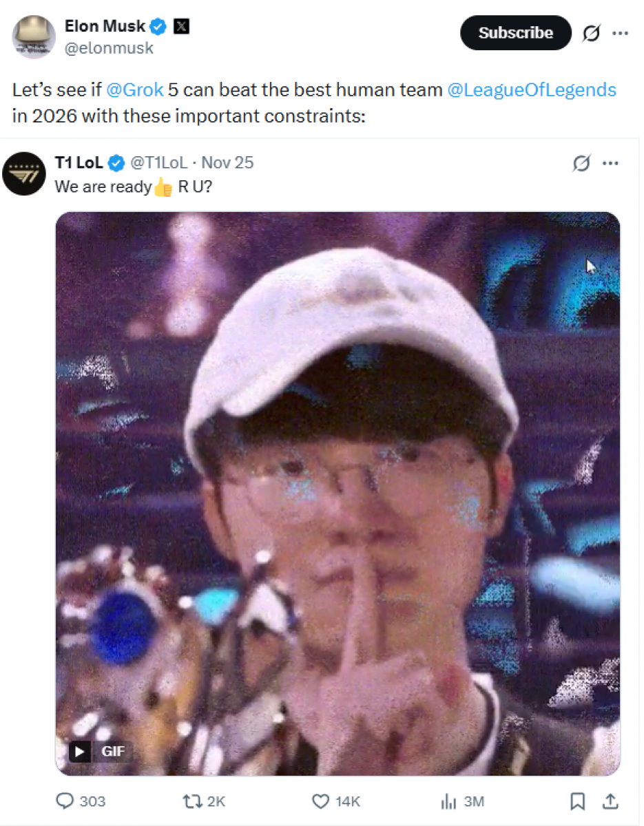 테슬라 CEO의 도발적인 제안, LoL 황제 페이커의 소속팀 T1이 내놓은 한마디는?