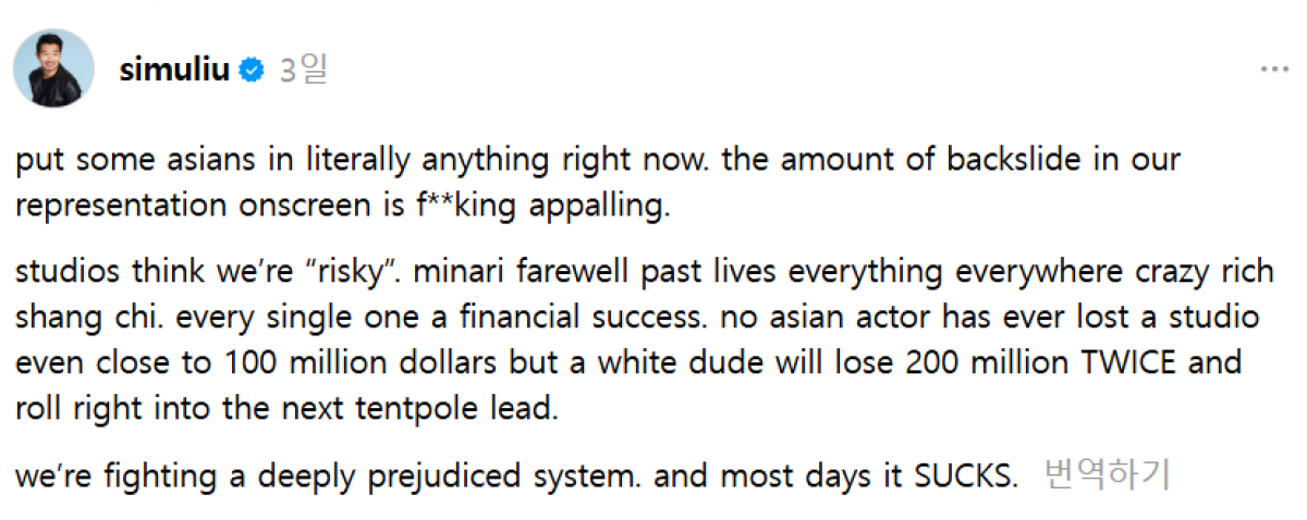 “아시아 배우는 1400억 손실 낸 적도 없는데” SNS 통해 인종차별 문제 정면 비판