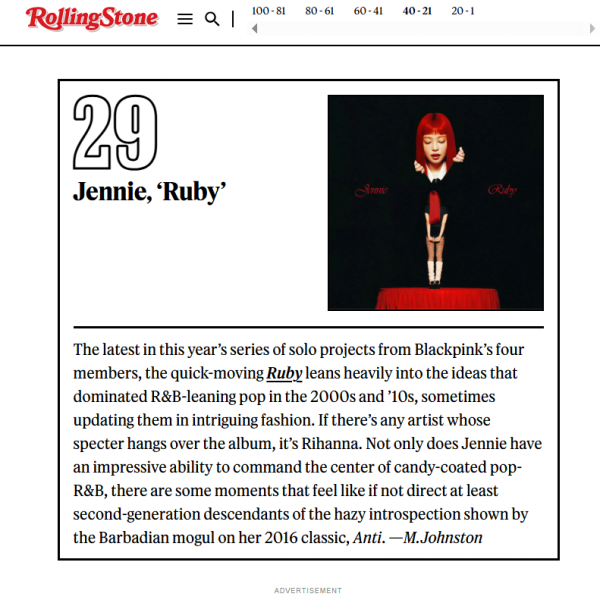 가장 높은 순위를 기록한 제니의 ‘루비’는 평단의 압도적인 호평을 받았다. 롤링스톤은 제니의 앨범에 대해 “2000년대와 2010년대 알앤비(R&B)풍 팝을 지배했던 아이디어들을 적극적으로 끌어오며, 때로는 그것을 흥미롭게 현대적으로 재해석했다”고 분석했다.