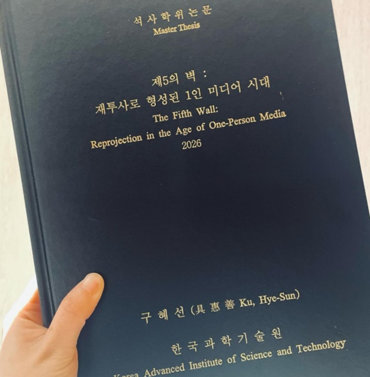 함께 공개된 석사학위 논문 표지에는 ‘제5의 벽: 재투사로 형성된 1인 미디어 시대’라는 연구 제목이 선명하게 적혀 있어, 그가 연예계 활동 경험을 바탕으로 심도 있는 학문적 연구를 수행했음을 짐작게 했습니다.