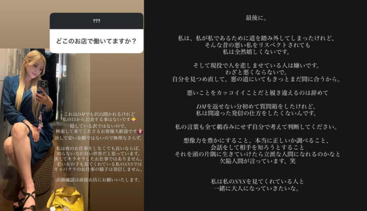 그는 밤일에 대해 “안 해도 된다면 모르는 편이 좋은 세계”라며, 화려한 이미지로만 소비되는 시선을 경계했습니다. 또 “어린 여자친구들도 보는 제 SNS에서 카바쿠라의 모습을 올릴 일은 없을 거예요”라고 밝혀, 자극적인 노출로 관심을 끌 생각이 없다는 점도 분명히 했습니다.‘불량연애’가 만든 관심…방송 밖으로 번진 질문들