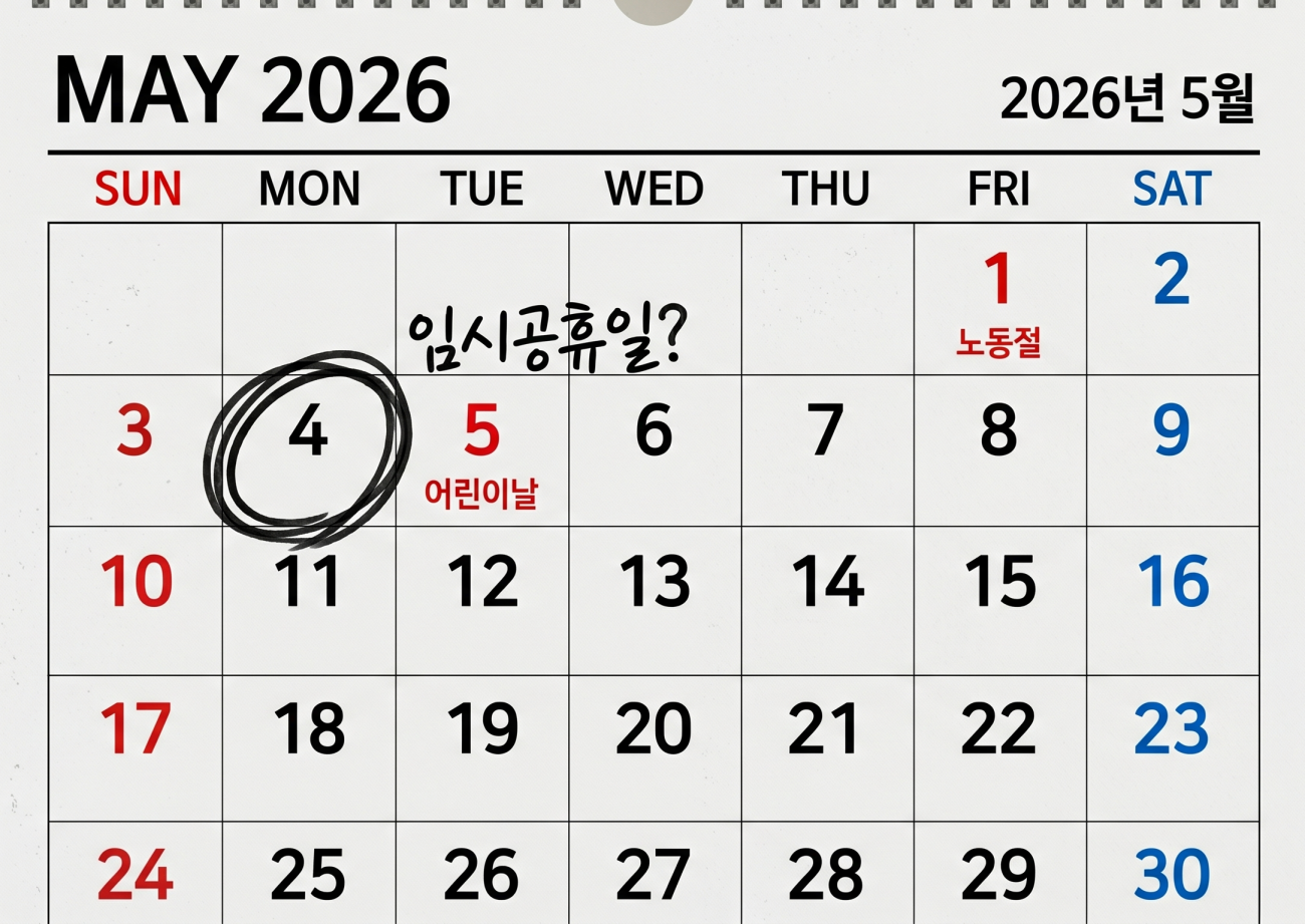 이번 논란의 출발점은 5월 초 연휴 구조다. 올해부터 5월 1일 노동절이 공휴일로 적용되면서 금요일인 1일부터 주말(2~3일), 그리고 어린이날(5일)까지 이어지는 일정이 형성됐다. 문제는 이 사이에 낀 4일이다. 이른바 ‘샌드위치 데이’로 불리는 이날이 임시공휴일로 지정되면 최대 5일 연휴가 완성된다.