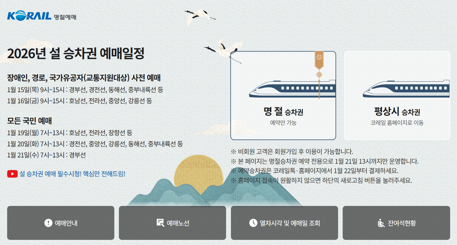 한국철도공사에 따르면 올해 설 연휴 열차 승차권 예매는 코레일톡 앱과 코레일 홈페이지, 철도고객센터를 통해 비대면 방식으로 진행된다. 예매는 철도회원만 가능하며, 연휴 기간 운행하는 열차를 대상으로 일정이 세분화돼 운영된다.