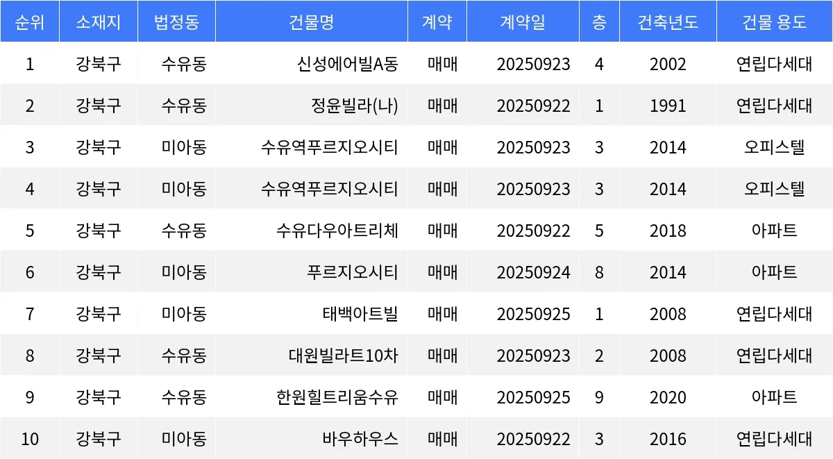 국토교통부 실거래가 공개시스템에 따르면, 9월 4주차 강북구 부동산 시장에서 수유동 신성에어빌A동이 주간 최저 매매가를 기록했다. 수유동 신성에어빌A동 26.13㎡ 4층 매물이 9천6백만원에 거래되었다.수유동 정윤빌라 59.43㎡ 1층 매물이 1억1천만원에 손바뀜이 있었다. 미아동 수유역푸르지오시티 22.426㎡ 3층 매물은 1억1천5백만원에 거래됐다. 같은 건물의 또 다른 22.426㎡ 3층 매물도 1억1천5백만원에 거래되었다.