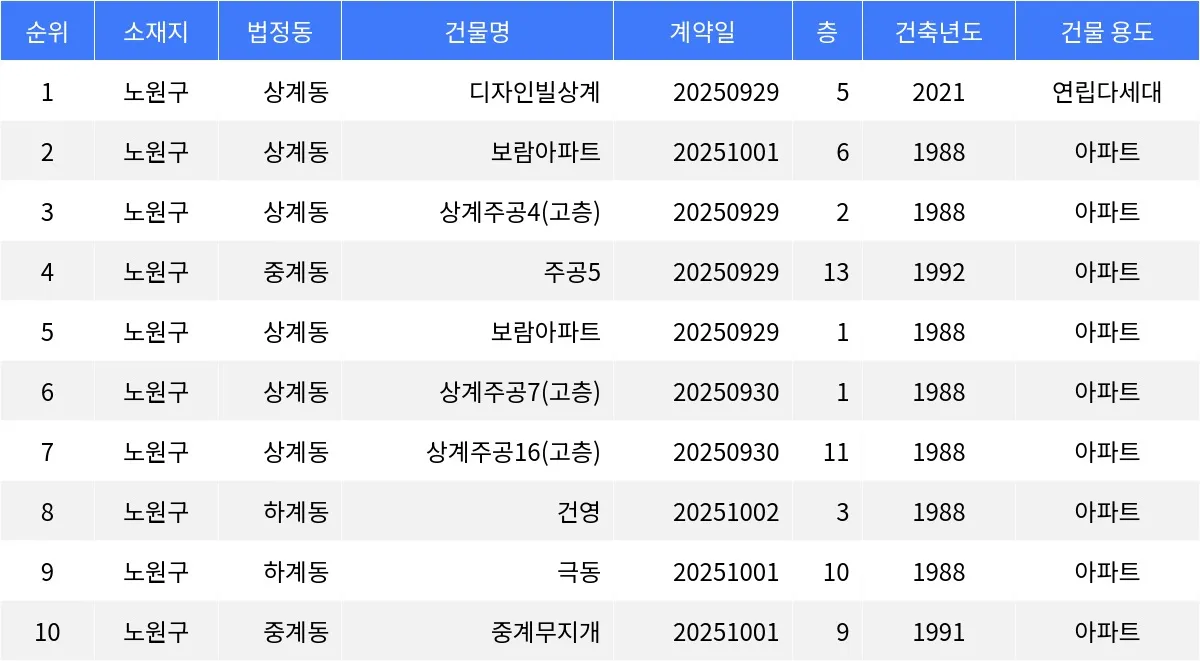 중계동 주공5 38.64㎡ 13층 매물이 4억3천500만원에 손바뀜이 일어났다. 상계동 보람아파트 54.59㎡ 1층 매물은 4억5천만원에 거래됐다.