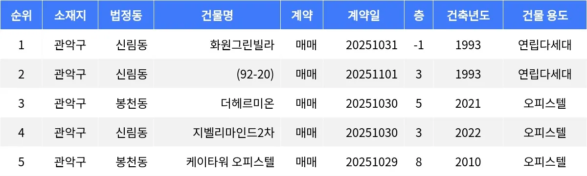 신림동 92-20번지 28.62㎡ 3층 매물은 2억9천만원에 거래됐다. 봉천동 더헤르미온 15.45㎡ 5층 매물은 2억4천만원에 거래됐다.