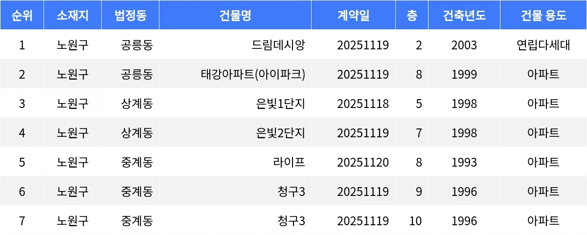 공릉동 태강아파트(아이파크) 49.6㎡ 8층 매물이 3억5천만원에 손바뀜이 일어났다. 상계동 은빛1단지 49.77㎡ 5층 매물이 4억2천3백만원에 거래됐다.