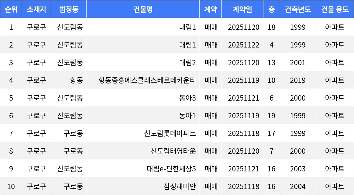 신도림동 대림1 134.99㎡ 18층 매물이 14억원에 거래됐다. 신도림동 대림1 101.48㎡ 4층 매물이 13억5천만원에 거래됐다. 신도림동 대림2 84.95㎡ 13층 매물이 13억2천만원에 거래됐다. 항동 항동중흥에스클래스베르데카운티 147.982㎡ 10층 매물이 13억원에 거래됐다. 신도림동 동아3 60㎡ 6층 매물이 12억5천만원에 거래됐다. 신도림동 동아1 59.978㎡ 19층 매물이 11억5천만원에 거래됐다. 구로동 신도림롯데아파트 131.3㎡ 17층 매물이 11억4천만원에 거래됐다. 구로동 신도림태영타운 59.88㎡ 7층 매물이 10억6천만원에 거래됐다. 신도림동 대림e-편한세상5 84.789㎡ 16층 매물이 10억원에 거래됐다. 구로동 삼성래미안 78.665㎡ 16층 매물이 9억2천만원에 거래됐다.