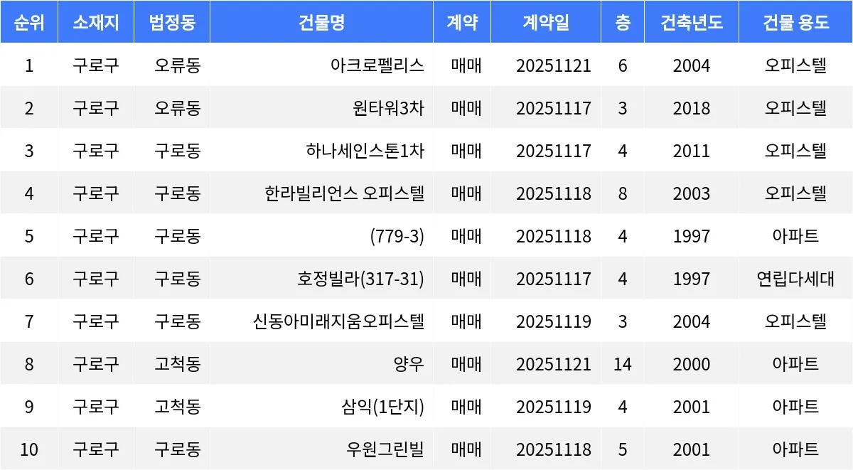 구로동 호정빌라 67.85㎡ 4층 주택 매물이 2억8천만원에 거래됐다. 구로동 신동아미래지움오피스텔 59.97㎡ 3층 매물은 3억2천5백만원에 손바뀜이 있었다.