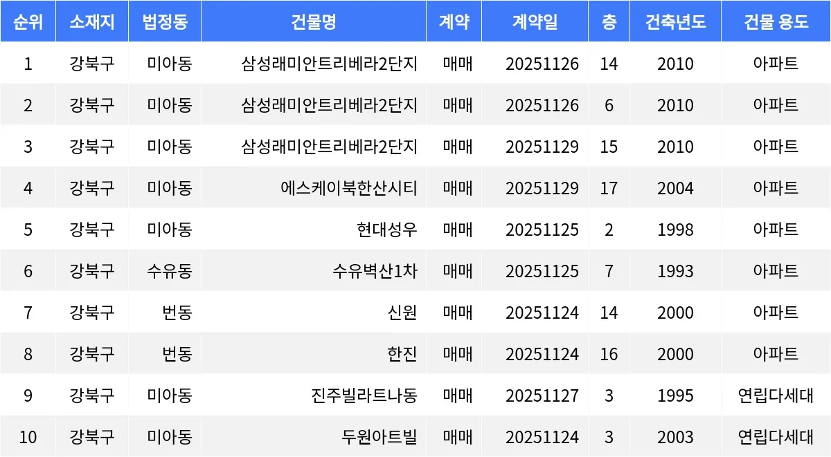 국토교통부 실거래가 공개시스템에 따르면, 11월 4주차 강북구 부동산 시장에서 미아동 삼성래미안트리베라2단지가 주간 최고 매매가를 기록했다. 이 아파트의 113.89㎡ 14층 매물이 11월 26일 10억8천만원에 손바뀜이 일어났다.