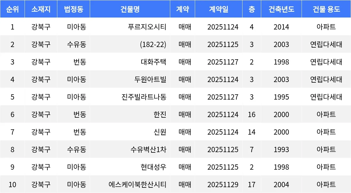 국토교통부 실거래가 공개시스템에 따르면, 11월 4주차 강북구 부동산 시장에서 미아동 푸르지오시티가 주간 최저 매매가를 기록했다. 미아동 푸르지오시티 18.65㎡ 4층 매물이 11월 24일 1억2천8백만원에 손바뀜이 일어났다.