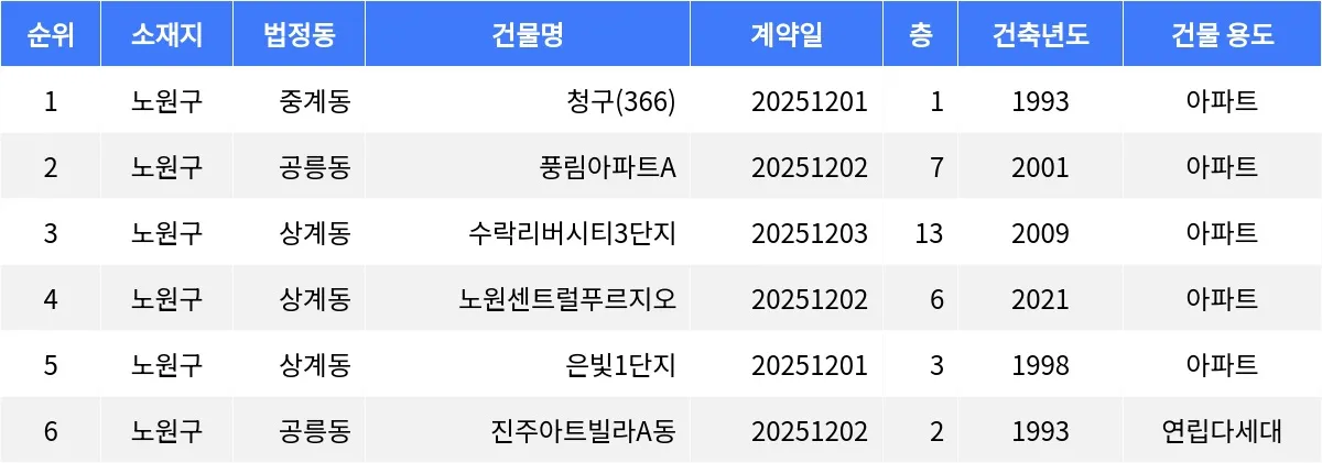 중계동 청구 115.47㎡ 매물이 12억3천만원에 거래됐고, 공릉동 풍림아파트A 84.99㎡ 매물이 8억5천만원에 손바뀜이 일어났다. 상계동 수락리버시티3단지 84.81㎡ 매물이 7억1천5백만원에 거래됐으며, 상계동 노원센트럴푸르지오 48.373㎡ 매물이 7억1천만원에 매매됐다. 상계동 은빛1단지 39.69㎡ 매물이 3억4천6백만원에 거래됐고, 공릉동 진주아트빌라A동 39.67㎡ 매물이 1억4천만원에 손바뀜이 일어났다.