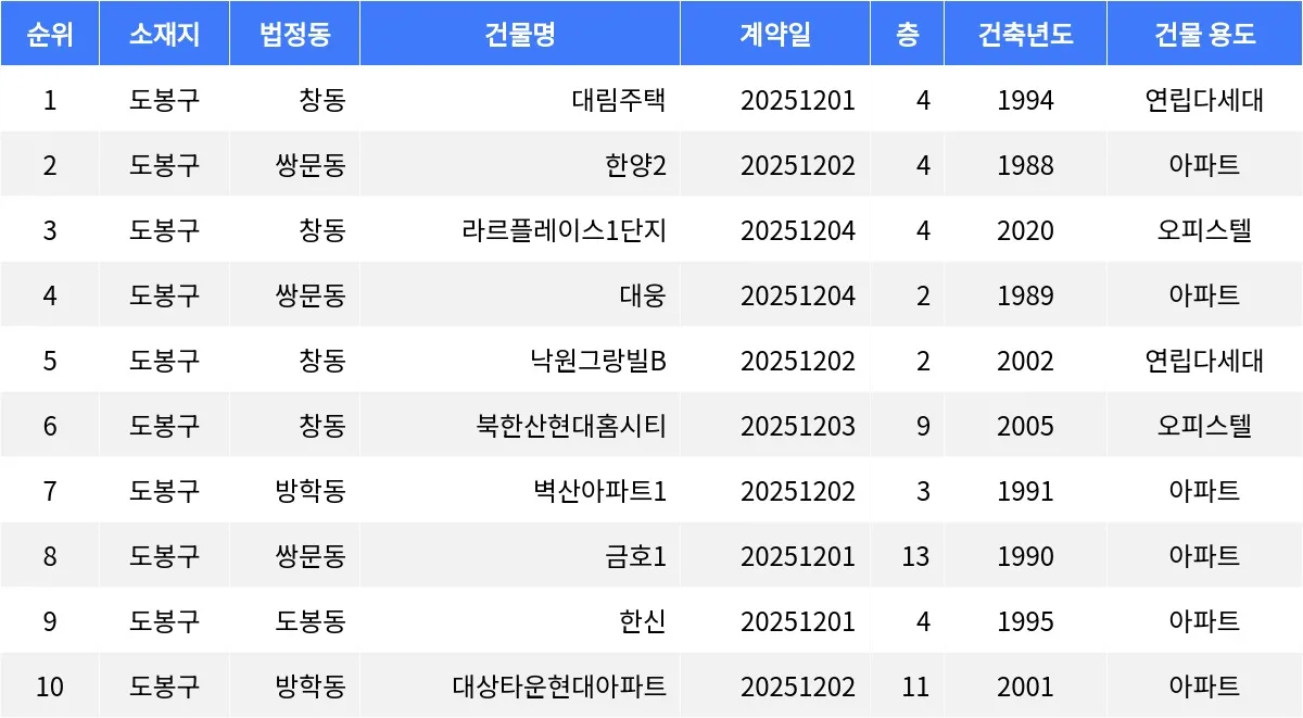 쌍문동 금호1 70.13㎡ 13층 매물이 5억1천3백만원에 거래됐다. 도봉동 한신 84.94㎡ 4층 매물이 5억5천만원에 매매됐다.