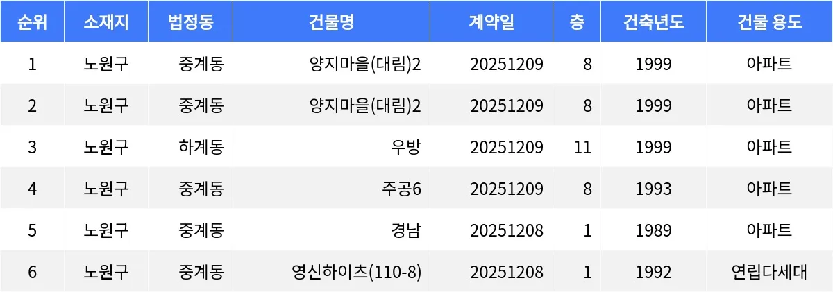 국토교통부 실거래가 공개시스템에 따르면, 12월 2주차 노원구 부동산 시장에서 중계동 양지마을(대림)2가 주간 최고 매매가를 기록했다. 중계동 양지마을(대림)2 114.81㎡ 8층 매물이 12월 9일 10억8천만원에 거래됐다.