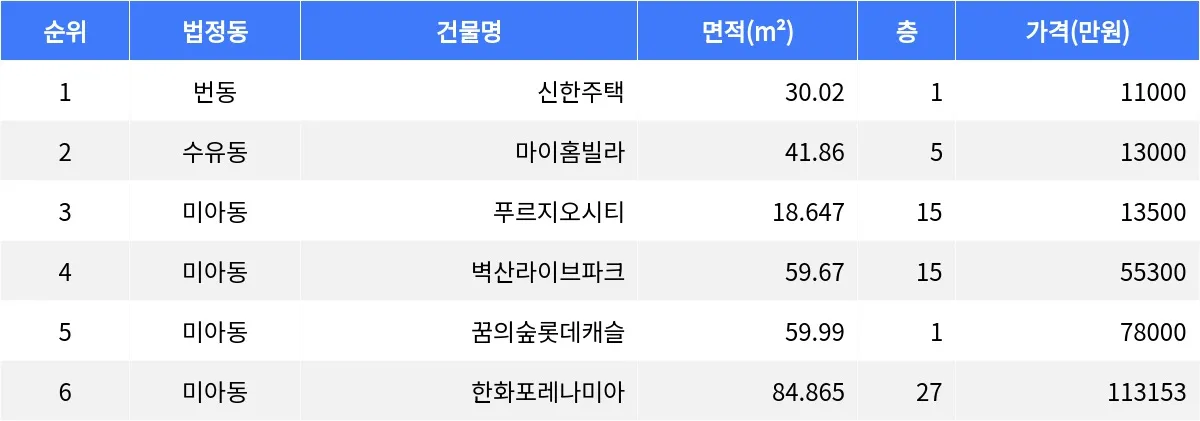 수유동 마이홈빌라 41.86㎡ 5층 매물이 1억3천만원에 손바뀜이 일어났다. 미아동 푸르지오시티 18.65㎡ 15층 매물이 1억3천5백만원에 거래됐다.