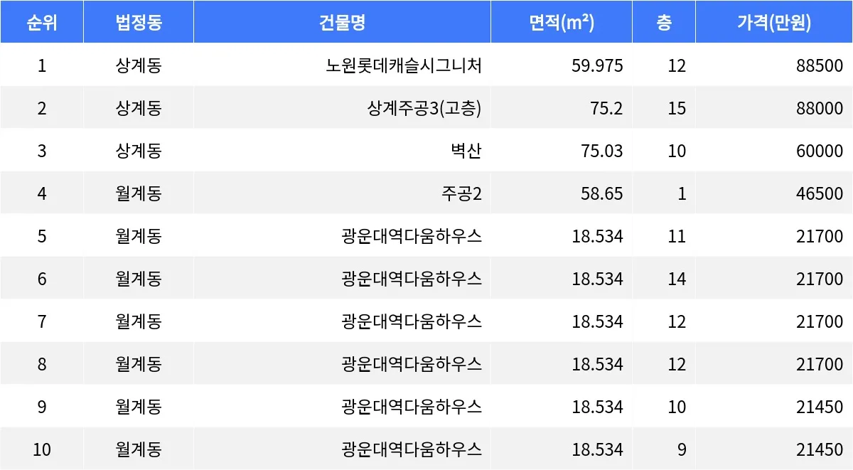 월계동 주공2 58.65㎡ 1층 매물이 4억6천5백만원에 거래됐다. 월계동 광운대역다움하우스 18.534㎡ 매물은 각각 2억1천7백만원에 거래되었다.