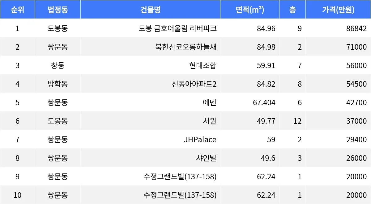 쌍문동 북한산코오롱하늘채 84.98㎡ 2층 매물이 7억1천만원에 거래됐다. 창동 현대조합 59.91㎡ 7층 매물은 5억6천만원에 매매가 이루어졌다.