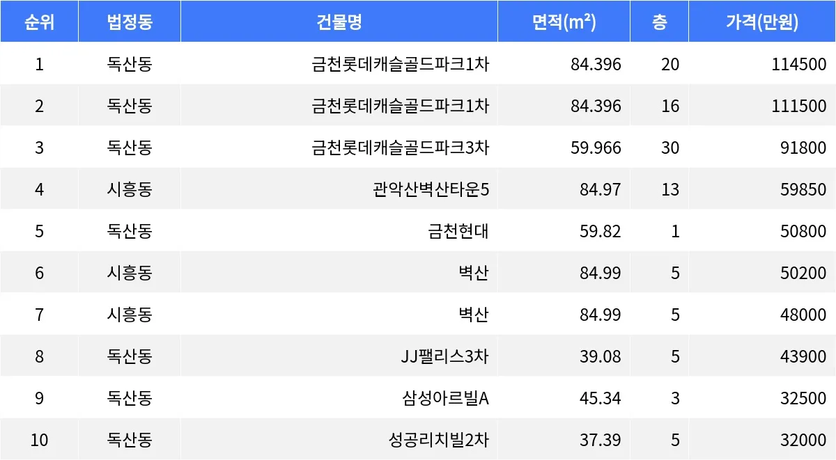 시흥동 관악산벽산타운5 84.97㎡ 13층 매물이 5억9천8백50만원에 팔렸다. 독산동 금천현대 59.82㎡ 1층 매물이 5억8백만원에 거래됐다.
